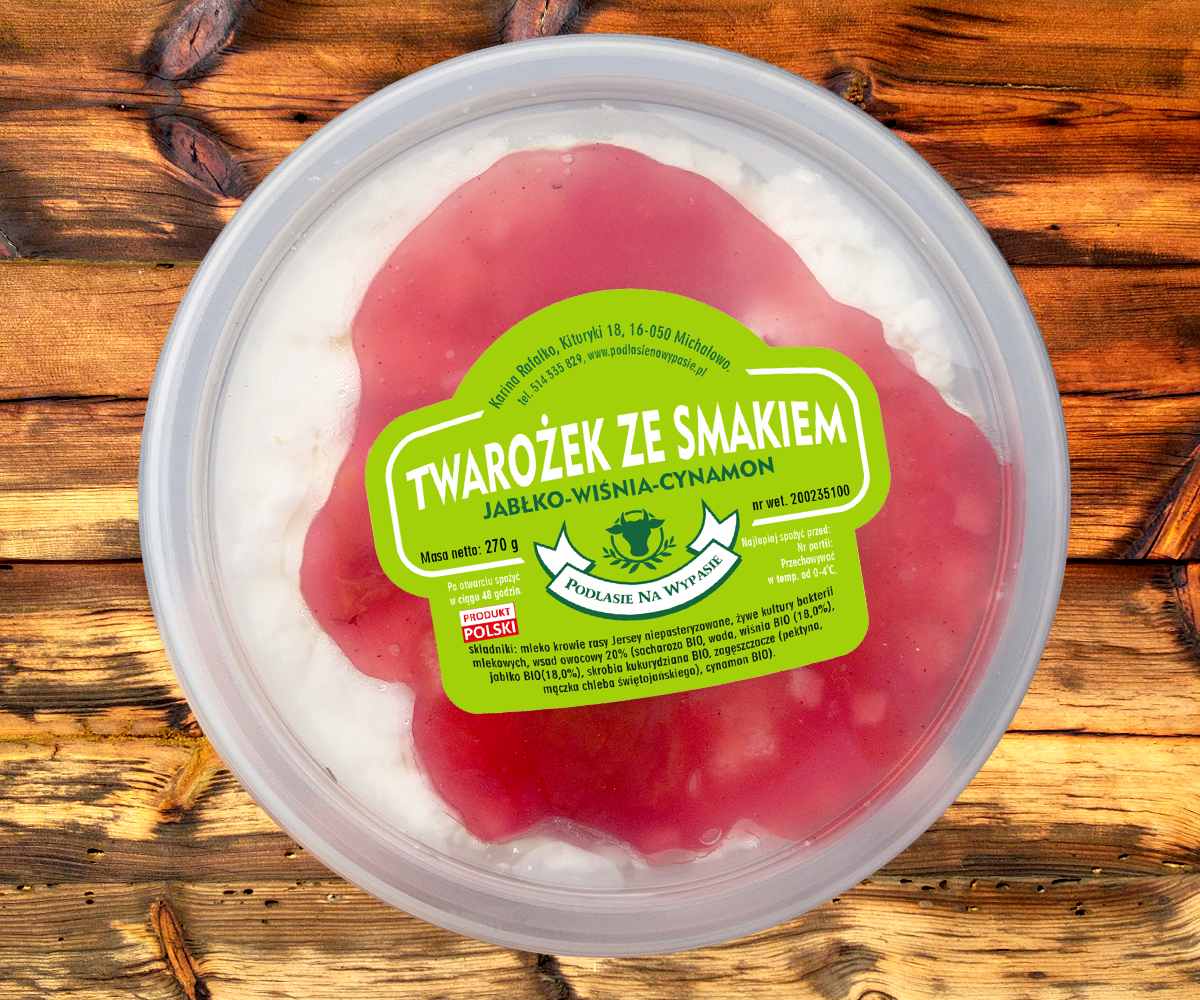 Delikatny, świeży, kremowy – wzbogacony o aromatyczne owoce:  jabłko-wiśnia-cynamon. Nasz twarożek powstaje z mleka A2 od krów rasy Jersey, które naturalnie zawiera więcej białka, wapnia i zdrowych tłuszczów niż mleko od innych ras.