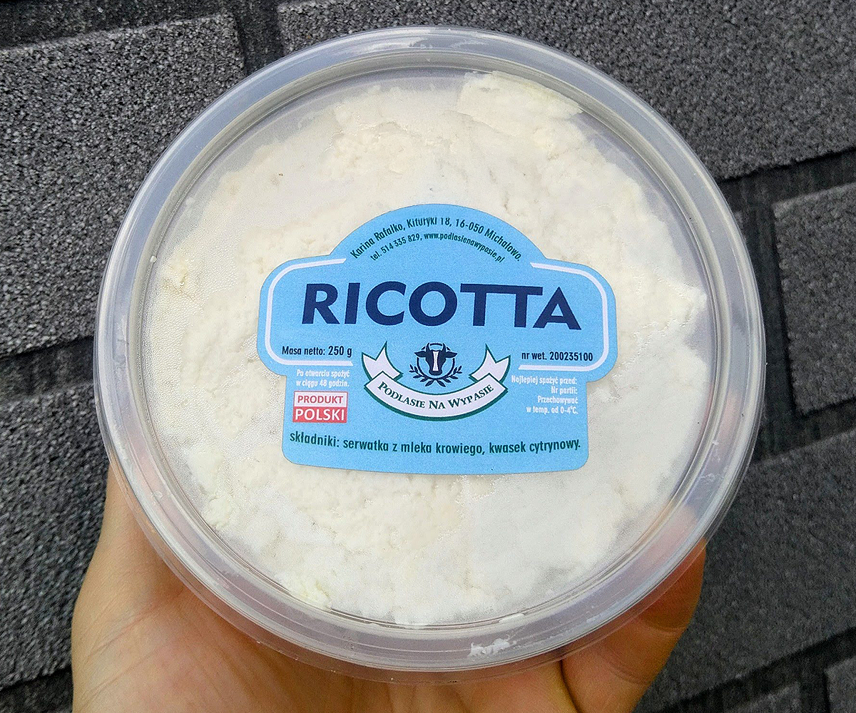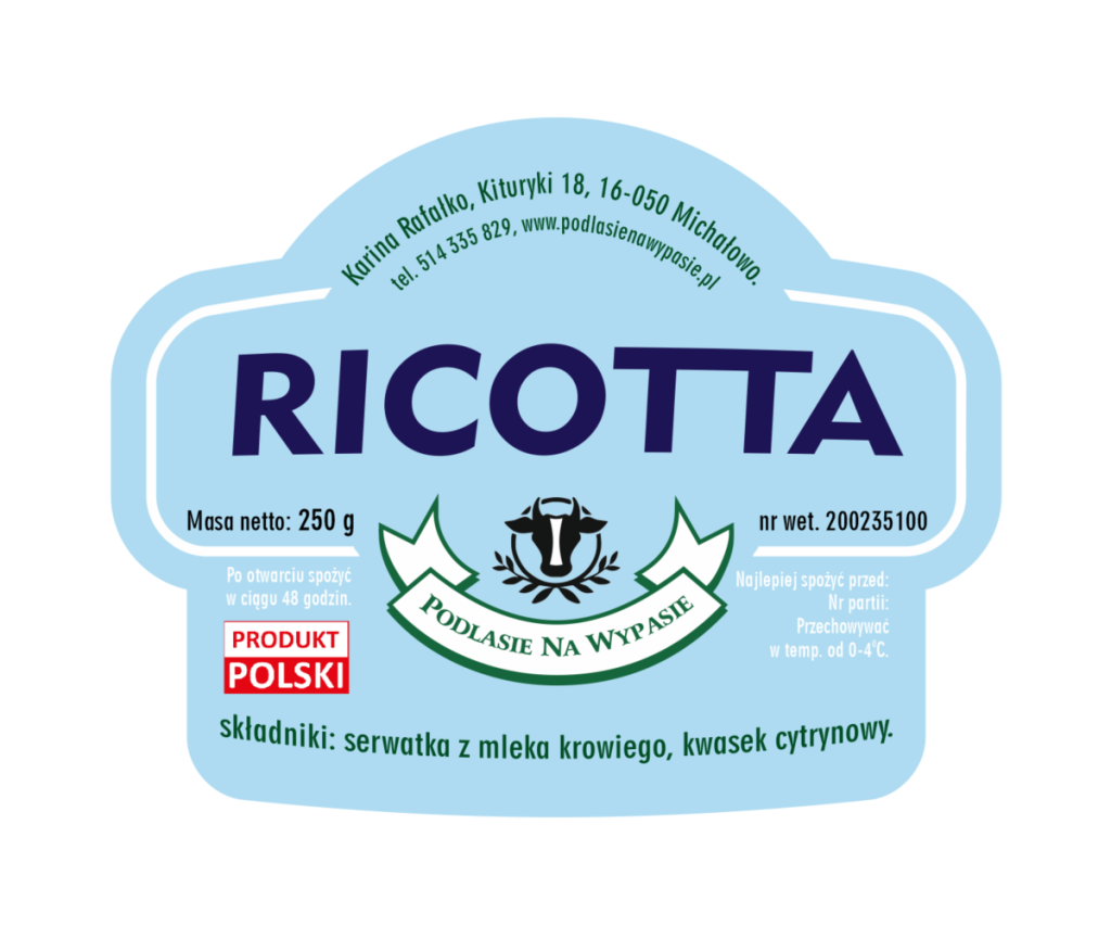 Nasza ricotta to delikatny, puszysty ser twarogowy wytwarzany z mleka białogrzbietych krów – tradycyjnej, polskiej rasy znanej z odporności i jakości mleka. Kluczowym elementem, który wyróżnia ten produkt, jest sposób żywienia zwierząt. Krowy wypasane są na łąkach i karmione wyłącznie naturalnym sianem i trawą, bez dodatku kiszonek i pasz przemysłowych. Dzięki temu mleko zachowuje czysty, naturalny skład, a gotowy ser jest lekki, łagodny w smaku i dobrze przyswajalny.