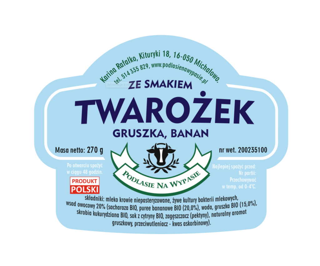 Twarożek powstaje z pełnowartościowego mleka krów rasy Białogrzbietej – zwierząt wypasanych na naturalnych pastwiskach, karmionych sianem, bez kiszonek i pasz przemysłowych. Ich mleko wyróżnia się delikatnym smakiem i bogactwem składników odżywczych: białka, wapnia oraz zdrowych tłuszczów.